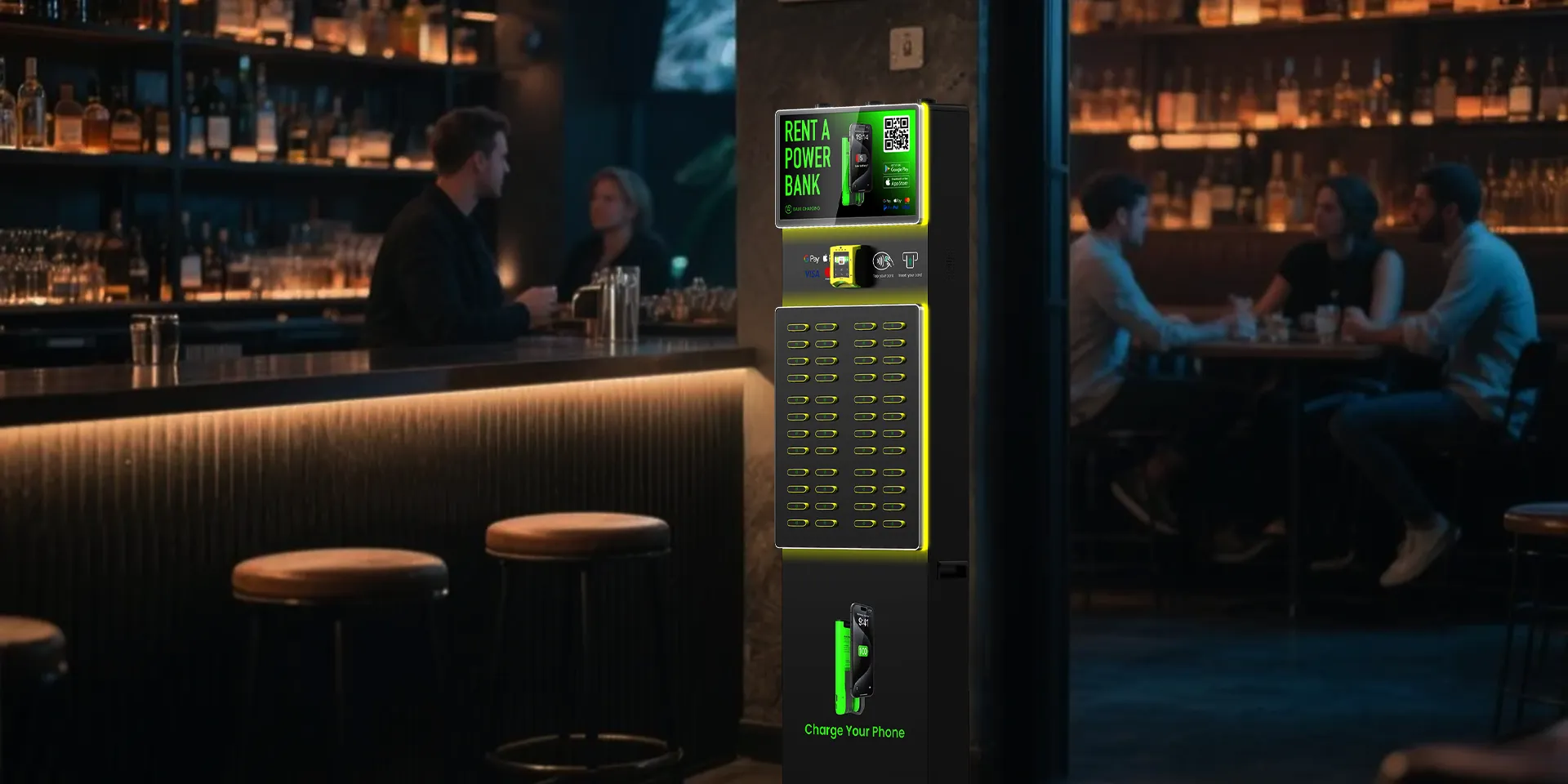 酒吧、KTV、夜等娱乐社交类场所,夜间充电需求高频集中。用户停留时间长、社交互动频繁,智能手机高频操作,电量消耗迅速。用户租借意愿强,单次使用时长较高,能有效提升夜间租借量。
