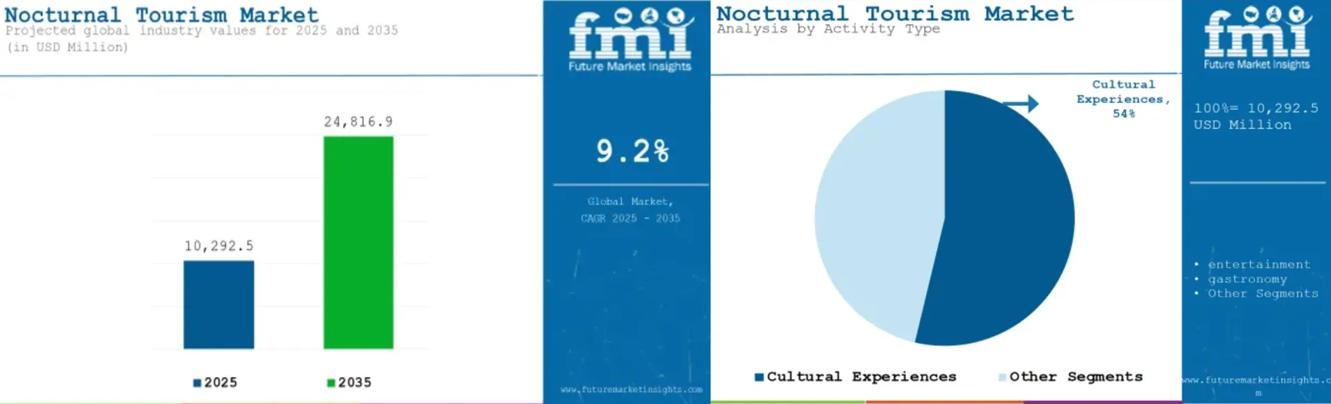 旅游业的发展正逐渐从白天延伸至夜间,越来越多的景点和城市,开始推出夜间旅游项目,满足游客夜间出行和娱乐需求。Future Market Insights预计,全球夜间旅游市场规模在2025年达到102.925亿美元,在2035年预计能增长至248.169亿美元。