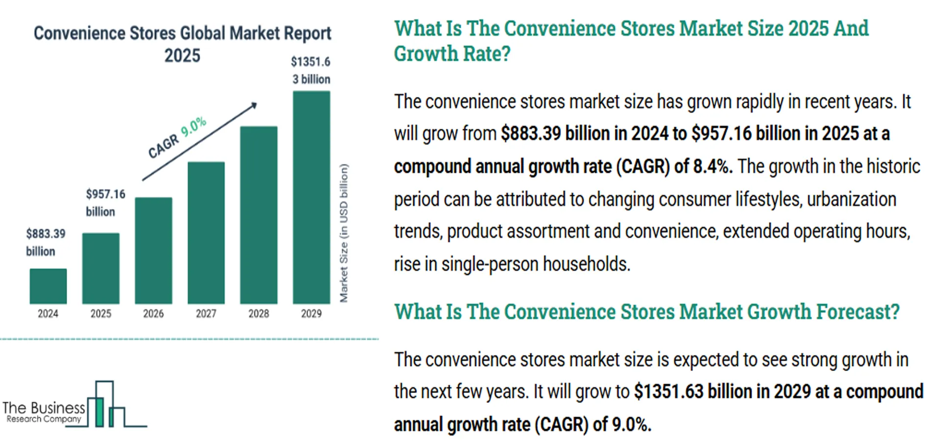 根据The Business Research Company的数据,全球便利店市场规模预计将在2029年达到1.35万亿美元。24小时营业的便利店,广泛分布在办公区、居民区与商业区,以即时餐饮和日常消费品,为用户提供全时段、多品类的便捷消费服务。